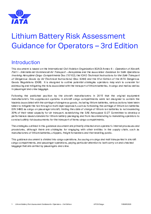 This document is based on the International Civil Aviation Organization (ICAO) Annex 6 – Operation of Aircraft, Part I – International Commercial Air Transport – Aeroplanes and the associated Guidance for Safe Operations Involving Aeroplane Cargo Compartments Doc (10102), the ICAO Technical Instructions for the Safe Transport of Dangerous Goods by Air (Technical Instructions) (Doc 9284) and the 61st Edition of the IATA Dangerous Goods Regulations (DGR). It is designed to outline potential strategies operators may wish to consider for addressing and mitigating the risks associated with the transport of lithium batteries, in cargo and mail as well as in passenger and crew baggage.