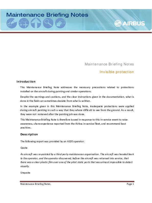 This Maintenance Briefing Note addresses the necessary precautions related to protections installed on the aircraft during painting and similar operations. Despite the warnings and cautions, and the clear instructions given in the documentation, what is done in the field can sometimes deviate from what is written. This Maintenance Briefing Note is therefore issued in response to this in service event to raise awareness, share experience reported from theAirbus in service fleet, and recommend best practices.