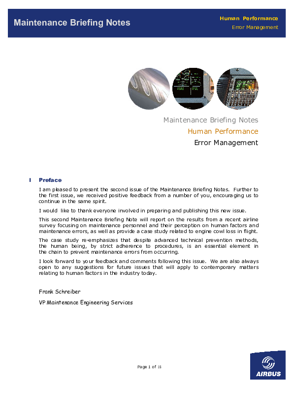 This Maintenance Briefing Note reports on the results from a recent airline survey focusing on maintenance personnel and their perception on human factors and maintenance errors, as well as provide a case study related to engine cowl loss in flight.