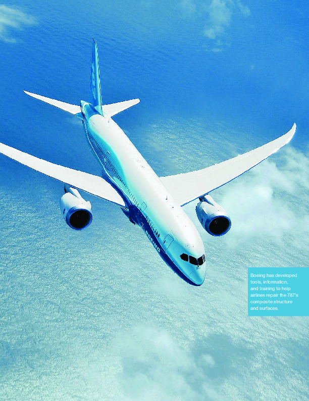Boeing has developed unique tools, information, and training to help airlines make repairs to the 787s composite structure and surfaces. These tools enable airlines to make effective repairs to many different types of damage, in many cases without leaving the gate.