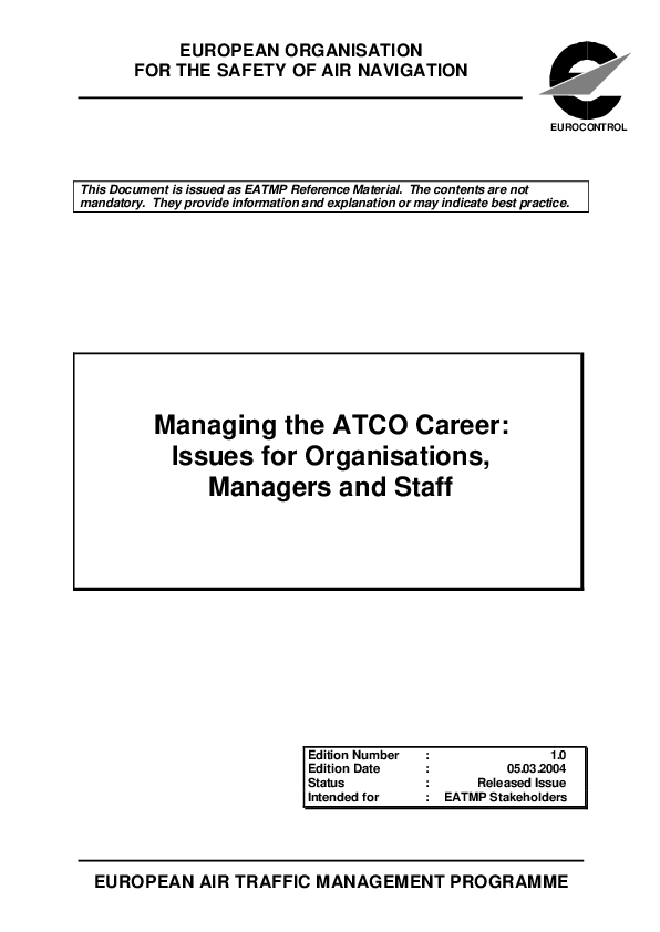 This document provides an insight into the issues for managing the Air Traffic Controller (ATCO) career as seen from the different perspectives of the organisation, managers and individual staff. These issues are more visibly coming to the fore as Air Navigation Service Providers (ANSPs) and Air Traffic Management (ATM) organisations increasingly face environmental, organisational and societal changes from outside. Such changes present a challenge to retain skilled staff in the face of changing staff attitudes towards career, job satisfaction and personal growth.