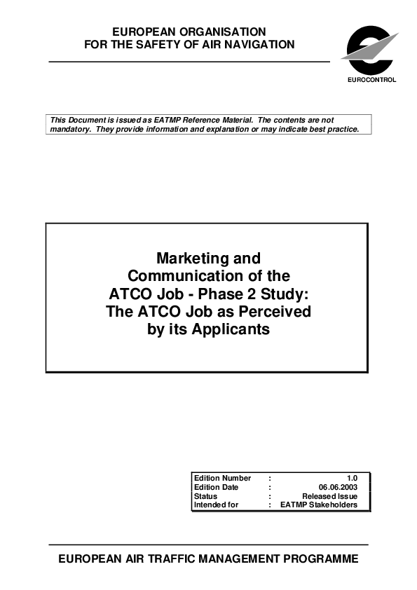 This report summarises the findings across countries of Phase 2 of the Air Traffic Controller (ATCO) Job Marketing and Communication Study conducted in 2001 within the European Air Traffic Management Programme (EATMP) by the Human Factors Management Business Division (DAS/HUM) of EUROCONTROL, formerly known as the Human Factors and Manpower Unit (DIS/HUM). It contains an analysis of 1,912 replies to a questionnaire from applicants for the ATCO job. The data originate from six Air Navigation Service Providers (ANSPs). The report provides information (inter alia) on how applicants learn about the ATCO job, what influences their choice, what job perceptions they have, what working conditions are important to them, what are their perceived images of the job and what alternative jobs they consider. This report also segments the applicant population into different target groups and analyses their possible corresponding communication messages.