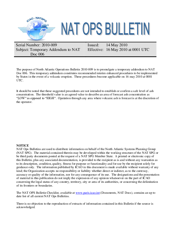 The North Atlantic Operations Bulletin 2010-009 promulgates a temporary addendum to NAT Contingency Plan (NAT Doc 006). This temporary addendum constitutes recommended interim enhanced procedures to be implemented by States in the event of a volcanic eruption. These procedures became applicable on 16 May 2010 at 0001 UTC.