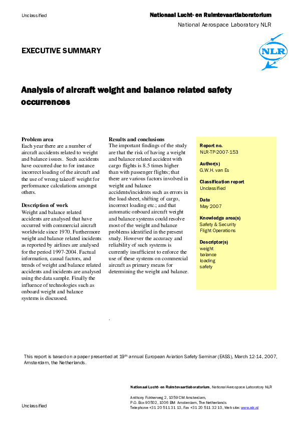 NLR - Analysis of aircraft weight and balance related safety occurrences - 2007