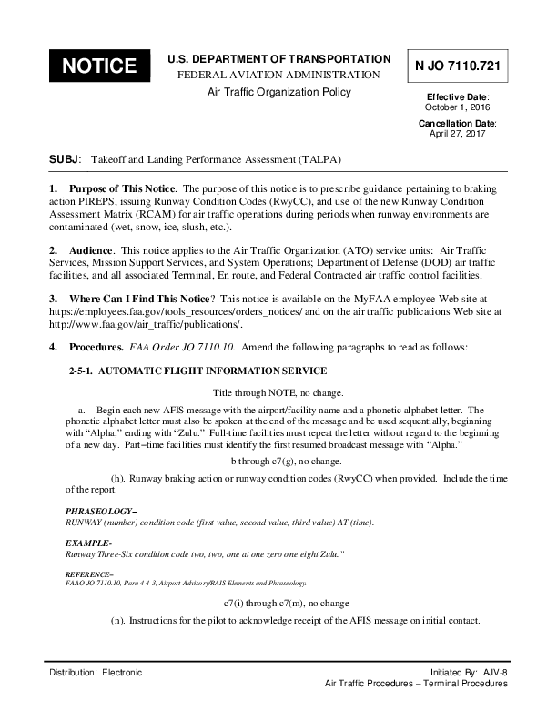 Notice JO 7110.721 Takeoff and Landing Performance Assessment (TALPA) Effective Date: October 1, 2016 Cancellation Date: April 27, 2017