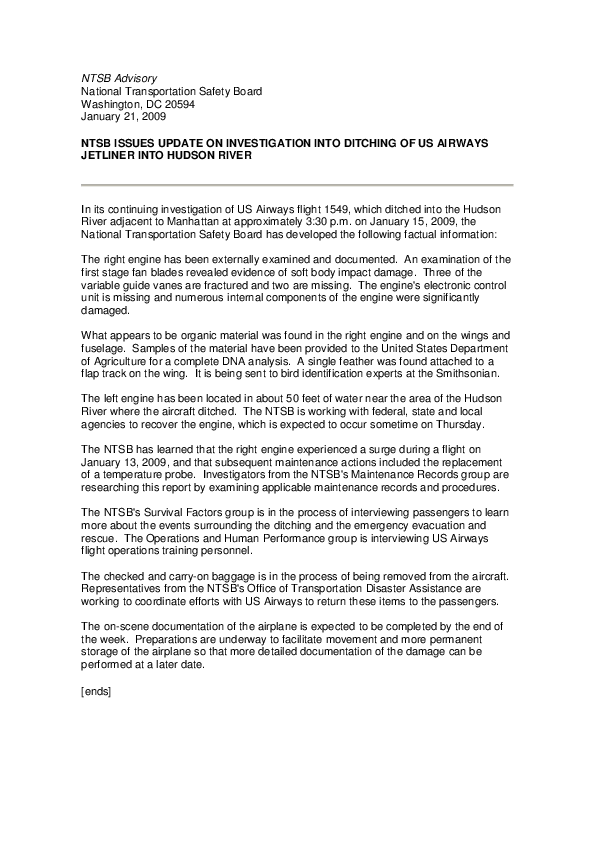 NTSB - Advisory 21 Jan 09, Hudson River A320 Ditching