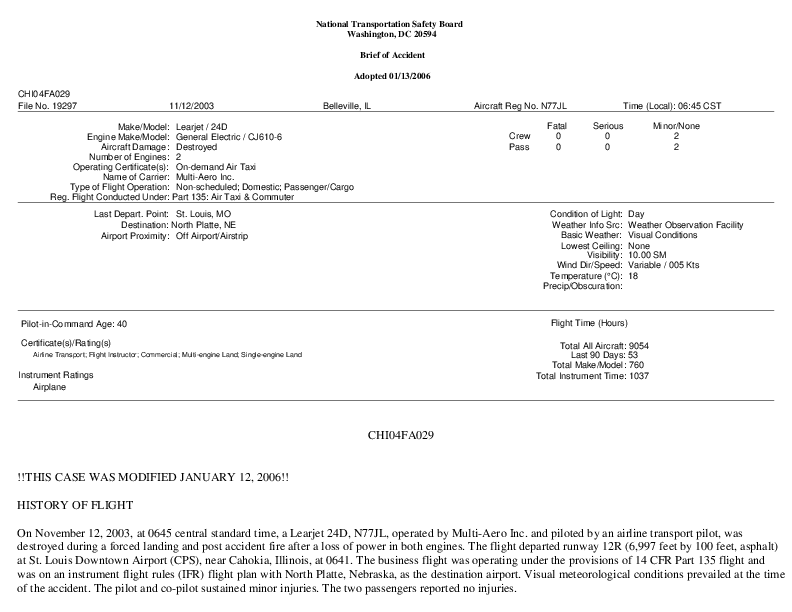 On November 12, 2003, a Bombardier Learjet 24D being operated on a non scheduled flight by Multi-Aero Inc. was destroyed during a forced landing and post crash fire following a loss of power in both engines after an encounter with a flock of birds just after take off from St. Louis Downtown Airport. Subsequent circumstantial evidence suggested that a flock of European Starlings might have been present. The flight had departed in accordance with a remotely issued take off clearance prior to the local ATC TWR opening.