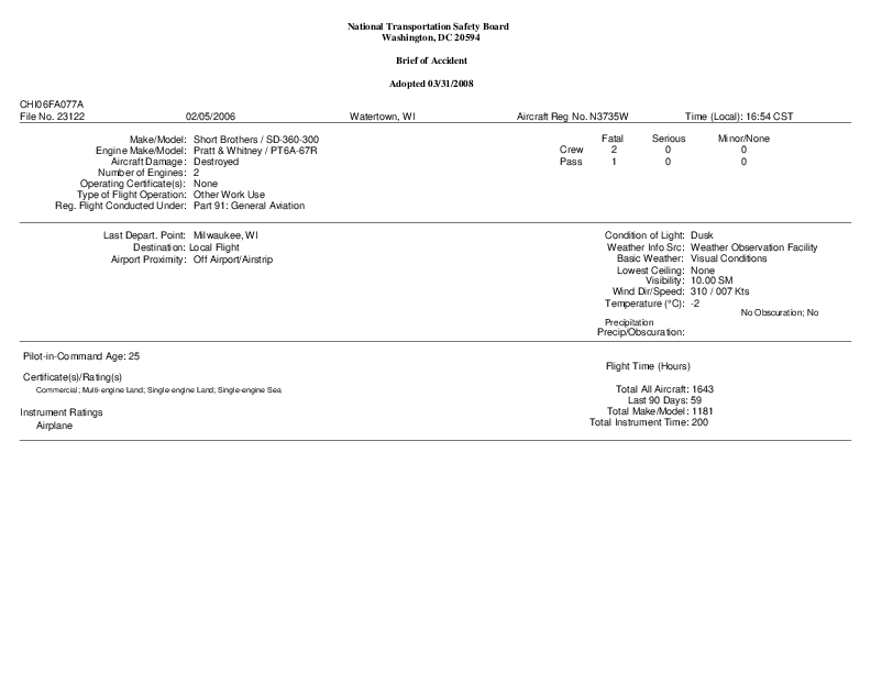NTSB - CHI06FA077A/B mid air collision between two SD-360-300, Watertown WI, 5 Feb. 2006