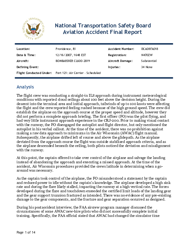 NTSB - DCA08FA018, CRJ3 Runway excursion, Providence RI USA, 16 Dec 2007