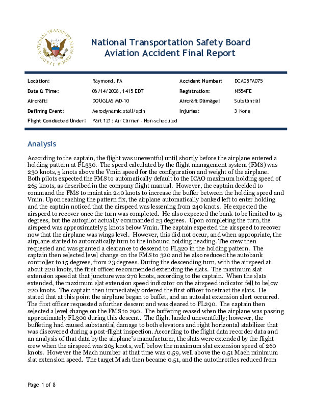NTSB - DCA08FA075, MD10 loss of control while in holding pattern, Raymond PA, 14 June 2008