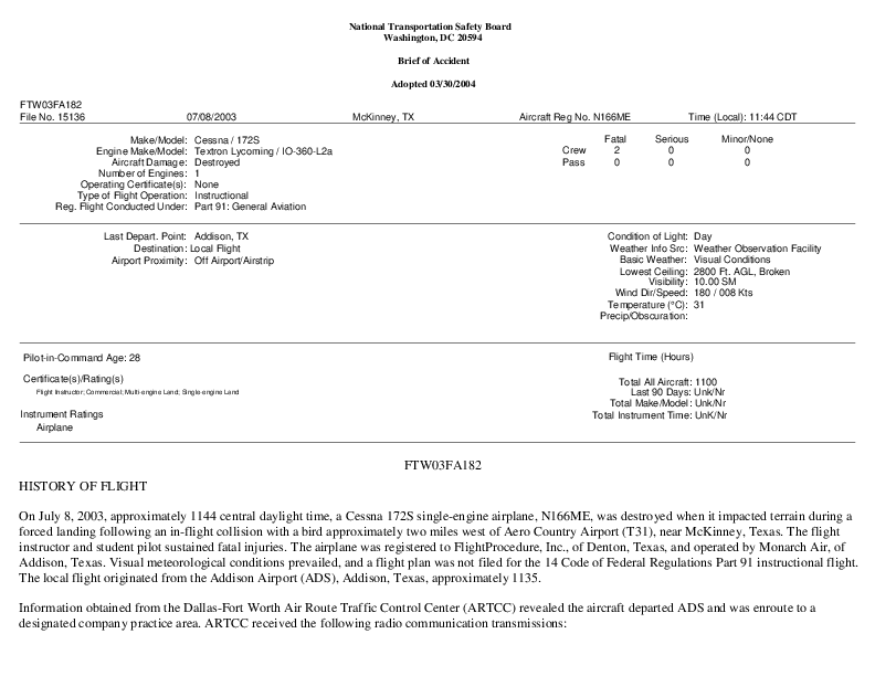 NTSB - FTW03FA182 C172 Birdstrike McKinney TX, 8 July 2003