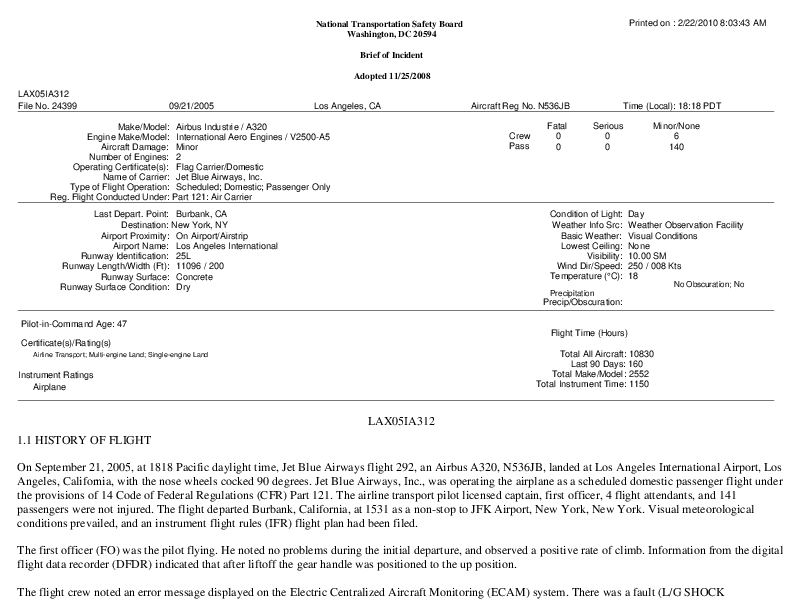 NTSB - LAX05IA312 A320 Nose gear assembly fault, LAX CA, 21 Sep 2005
