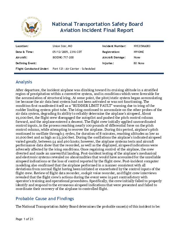 NTSB NYC05MA083, B712 loss of control due in-flight icing, Union Start MO, USA, 12 May 2005