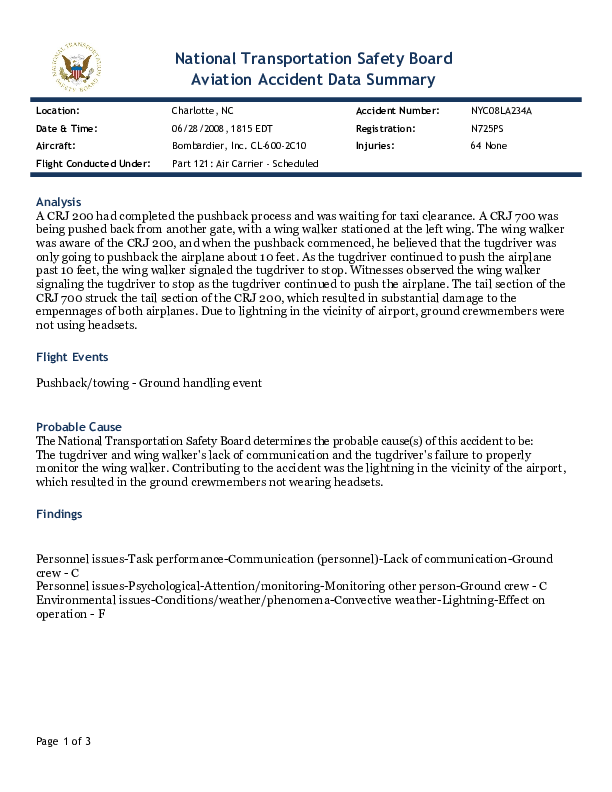 On 28 June 2008, a Bombardier CRJ 700 operated by PSA Airlines, during daytime pushback collided with a stationary CRJ 200 of the same company at Douglas International Airport Charlotte, North Carolina. Due to thunderstorm activity in the vicinity of the airport, the ground personnel were not wearing headsets which consequently resulted in inadequate coordination and ultimately in a collision.