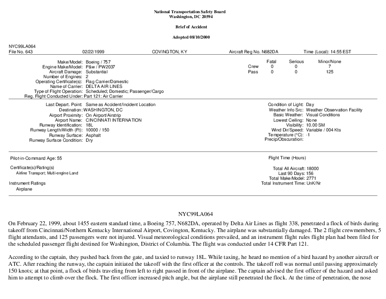 NTSB - NYC99LA064, B757 Bird Strike at Covington KY. 22 Feb 1999
