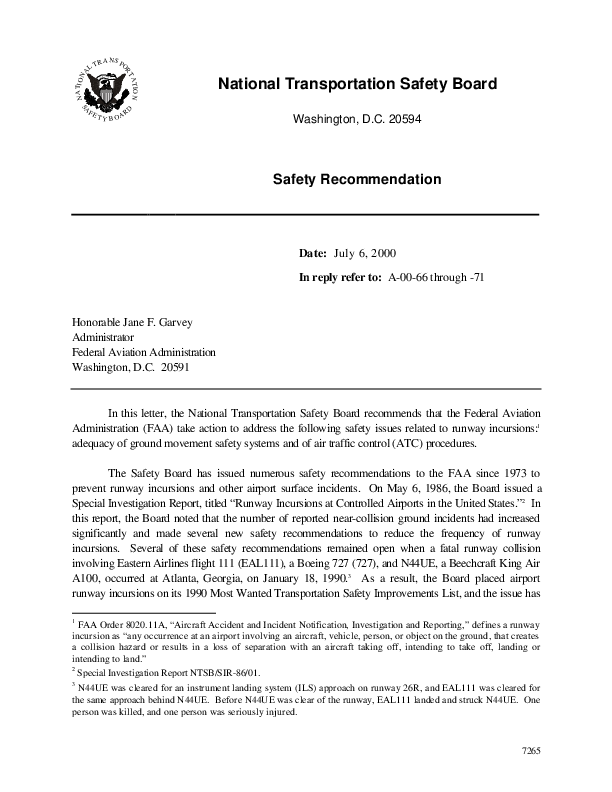 NTSB Runway Incursion Safety Recommendations A-00-66 to A-00-71