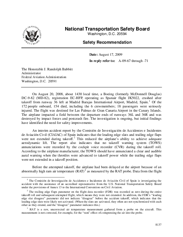 NTSB Safety Recommendations relating to Spanair MD82 accident at Madrid Barajas, Spain, 20 Aug 2008.