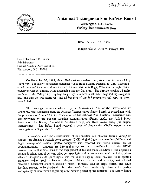 Following the release of the Official Report, and with the concurrence of the Columbian Aeronautica Civil, the NTSB, which had assisted with the Investigation, determined that it should also issue 17 further Safety Recommendations enclosed in this letter.