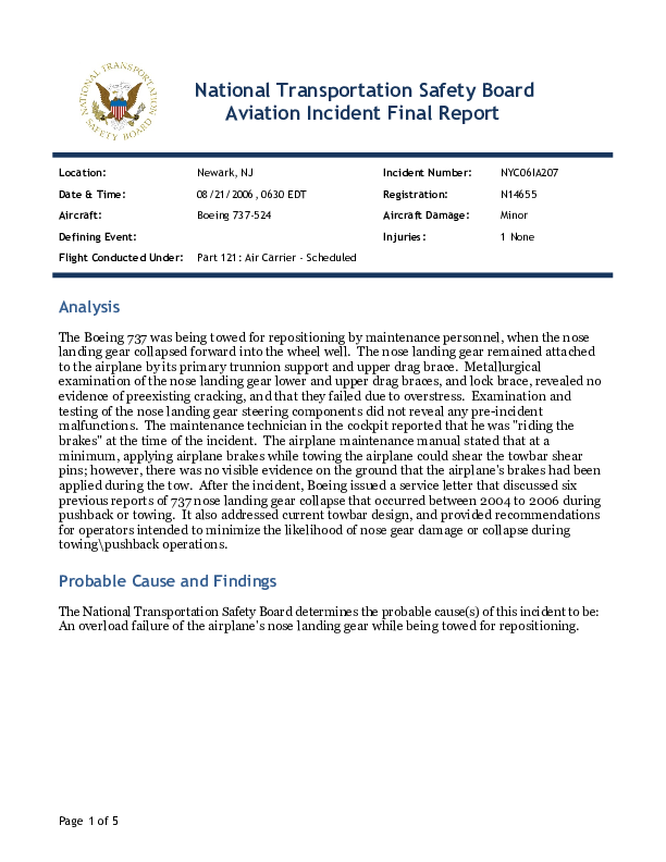 On 21 August 2006, a Boeing 737-500 suffered a nose landing gear collapse during towing at the Newark Liberty International Airport. A technical crew was repositioning the aircraft in visual meteorological conditions during the occurrence. No persons were injured and minor aircraft damage occurred.