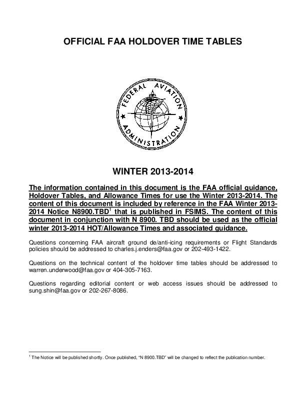 The information contained in this document is the FAA official guidance, Holdover Tables, and Allowance Times for use the Winter 2013-2014. The content of this document is included by reference in the FAA Winter 2013-2014. Notice N8900.TBD 1 that is published in FSIMS. The content of this document in conjunction with N 8900. TBD should be used as the official winter 2013-2014 HOT/Allowance Times and associated guidance.