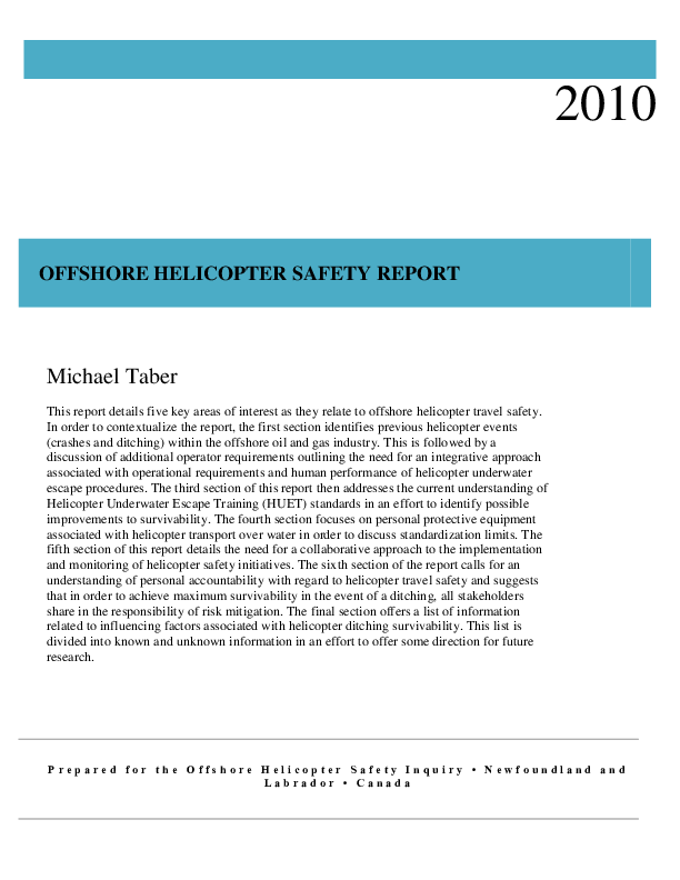This report details five key areas of interest as they relate to offshore helicopter travel safety. In order to contextualize the report, the first section identifies previous helicopter events (crashes and ditching) within the offshore oil and gas industry. This is followed by a discussion of additional operator requirements outlining the need for an integrative approach associated with operational requirements and human performance of helicopter underwater escape procedures. The third section of this report then addresses the current understanding of Helicopter Underwater Escape Training (HUET) standards in an effort to identify possible improvements to survivability. The fourth section focuses on personal protective equipment associated with helicopter transport over water in order to discuss standardization limits. The fifth section of this report details the need for a collaborative approach to the implementation and monitoring of helicopter safety initiatives. The sixth section of the report calls for an understanding of personal accountability with regard to helicopter travel safety and suggests that in order to achieve maximum survivability in the event of a ditching, all stakeholders share in the responsibility of risk mitigation. The final section offers a list of information related to influencing factors associated with helicopter ditching survivability. This list is divided into known and unknown information in an effort to offer some direction for future research.