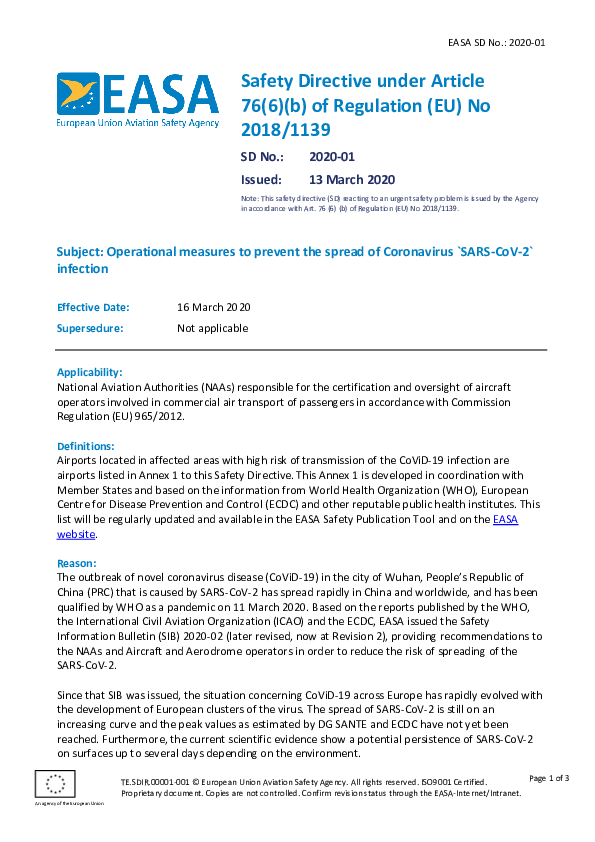 Safety Directive (SD) issued by EASA to reduce the risk of spread of the novel coronavirus (COVID-19) through flights to and from high risk areas. This is the first EU-wide operational measure to control the spread of COVID-19 in Europe.