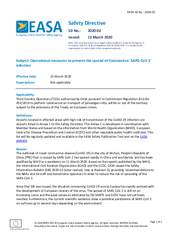 Safety Directive (SD) issued by EASA to reduce the risk of spread of the novel coronavirus through flights to and from high risk areas. This is the first EU-wide operational measure to control the spread of COVID-19 in Europe.