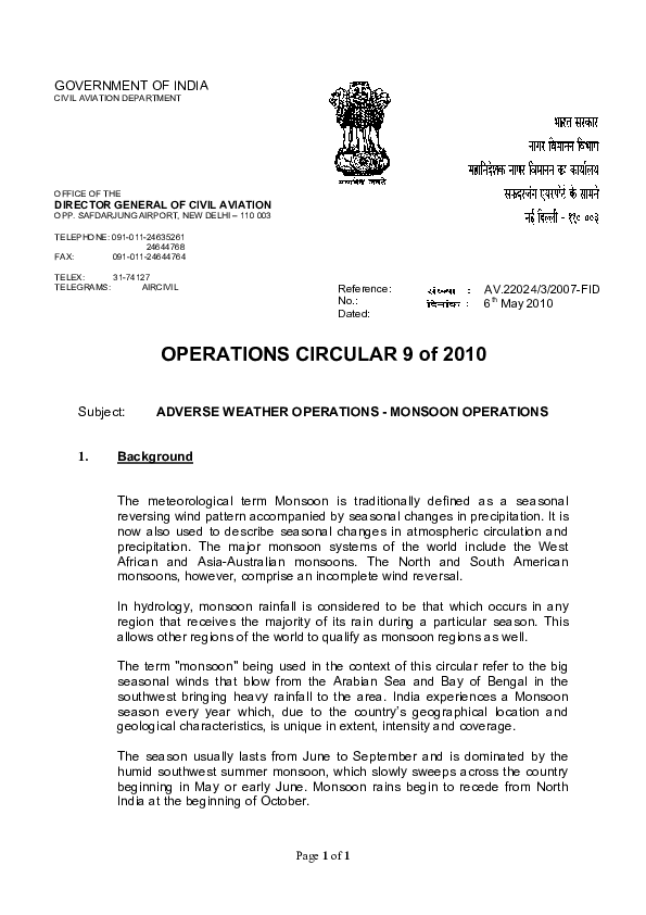 Guidance on operations during the Monsoon issued by the DGCA India to Indian airlines.