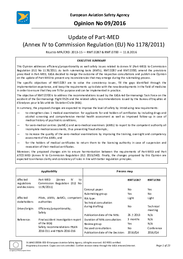 Opinion No 09/2016 Update of Part-MED (Annex IV to Commission Regulation (EU) No 1178/2011)
