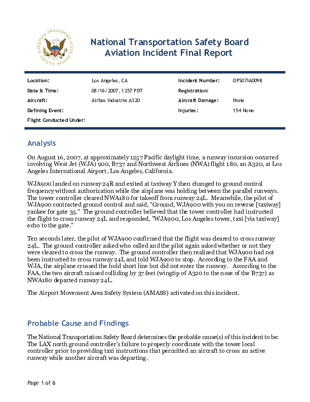 OPS07IA009B- A320 taxi in runway incursion, Los Angeles CA, USA, 16 Aug 2007