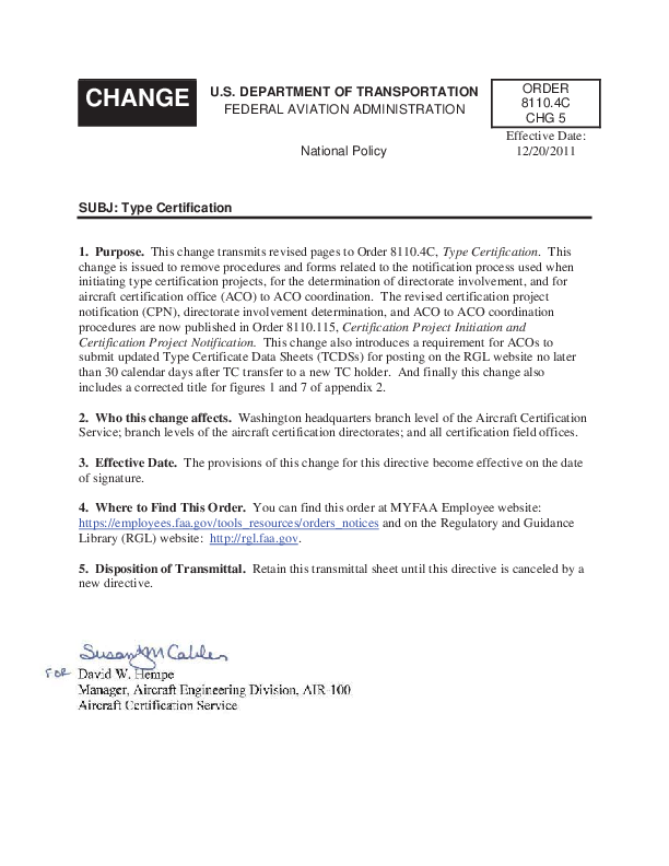 FAA Order 8110.4c ‘Type Certification’ issued 12 October 2005 as amended by CHG 5 and effective from 20 November 2011