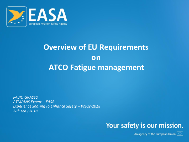 This presentation summarizes the EU Requirements on Air Traffic Controllers Fatigue Management, the Fatigue Management Policy and the Rostering System for ATCOs.