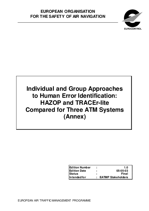 An independent comparison of two human error analysis techniques – HAZOP and TRACEr-lite – was performed for the three projects: Co-Space, Time-based Separation and CORA2. The annex report presents the detailed analysis performed for each study.