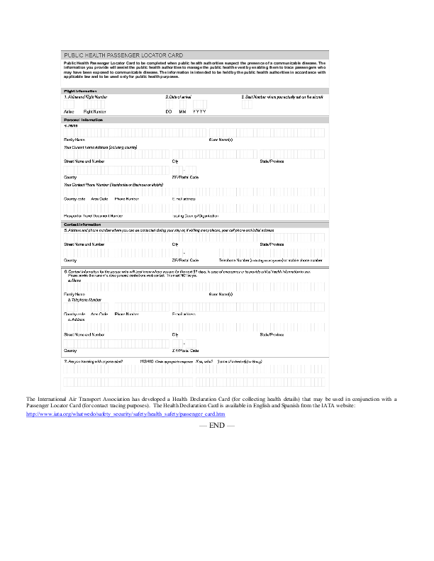 ICAO Public Health Passenger Locator Card to be completed when public health authorities suspect the presence of a communicable disease.