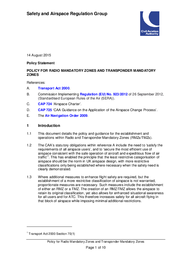 Policy Statement by Safety and Airspace Regulation Group, UK CAA, 14 August 2015 This document sets out the Civil Aviation Authority's (CAA) policy for the establishment of, and operations within, RMZs. The notification of RMZ airspace is consistent with the provisions of the Standardised European Rules of the Air (SERA).