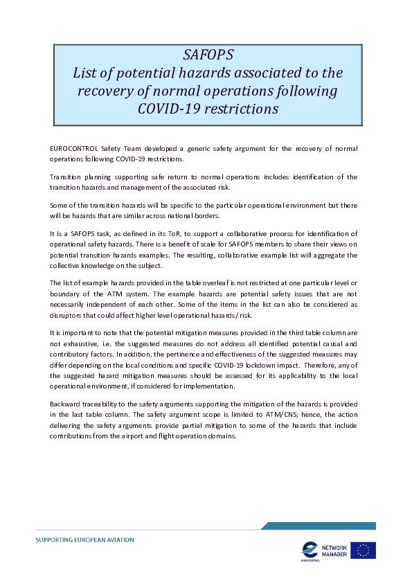 To support the risk assessment part of the Safety Argument a generic hazard identification of the ATM/ANS provision during the recovery period following the COVID-19 lockdown has been carried out. The output has been captured in a list of generic hazards that may occur during the extended period of transition to normal operations due to various factors related to the COVID-19 aviation lockdown.