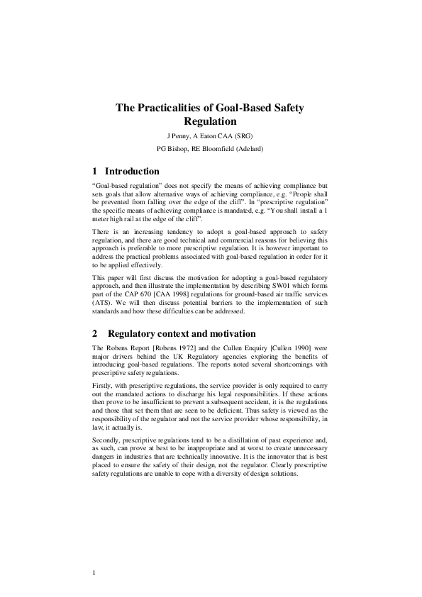 This paper will first discuss the motivation for adopting a goal-based regulatory approach, and then illustrate the implementation by describing regulations for ground-based air traffic services (ATS).