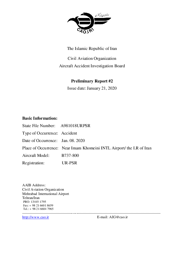 Preliminary report into shooting down of B738 in vicinity of Tehran on 8 January 2020.