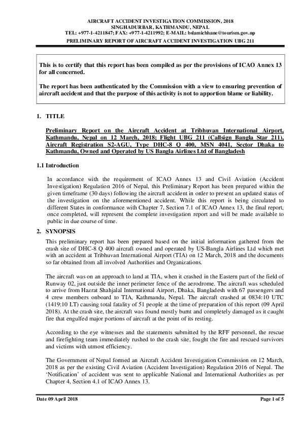 Preliminary report into Runway Excursion accident at Kathmandu on 12 March 2018 involving a DHC-8 operated by US-Bangla airlines.