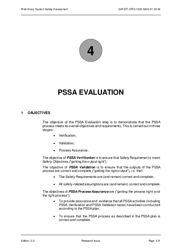 The objective of the PSSA Evaluation is to demonstrate that the PSSA process meets its overall objectives and requirements. The Evaluation is carried out in three stages: Verification, Validation and Process Assurance.