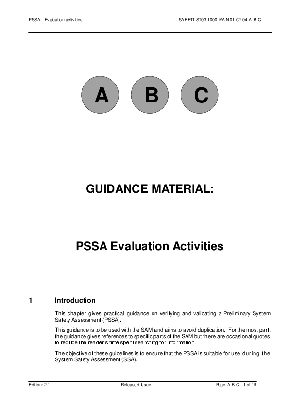 This guidance material provides practical guidance on verifying and validating a Preliminary System Safety Assessment (PSSA). The objective of these guidelines is to ensure that the PSSA is suitable for use during the System Safety Assessment (SSA).
