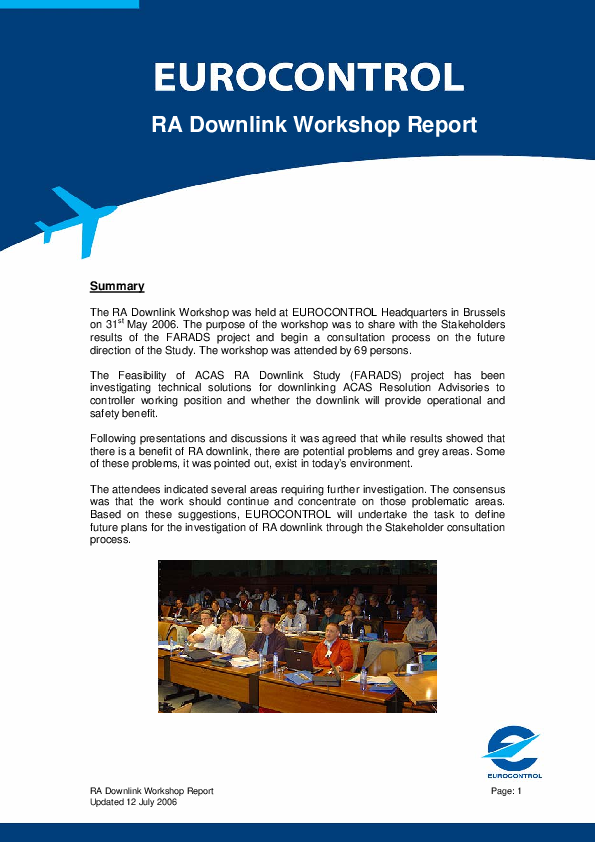 The RA Downlink Workshop was held at EUROCONTROL Headquarters in Brussels on 31st May 2006. The purpose of the workshop was to share with the Stakeholders results of the Feasibility of ACAS RA Downlink Study (FARADS) project and begin a consultation process on the future direction of the Study. The project has been investigating technical solutions for downlinking ACAS Resolution Advisories to controller working position and whether the downlink will provide operational and safety benefit. \r\nFollowing presentations and discussions it was agreed that while results showed that there is a benefit of RA downlink, there are potential problems and grey areas. Some of these problems, it was pointed out, exist in today’s environment. \r\n