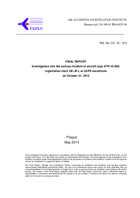 Ref. No. CZ -12 - 514, Final report on serious incident, AT45 airworthiness flight, Prague, Czech R.