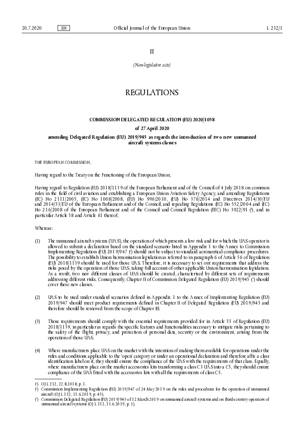 COMMISSION DELEGATED REGULATION (EU) 2020/1058 of 27 April 2020 amending Delegated Regulation (EU) 2019/945 as regards the introduction of two new unmanned aircraft systems classes. Entered into force in August 2020.