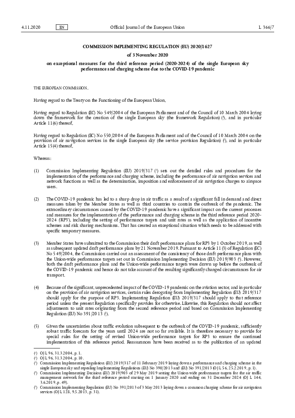 Regulation 2020/1627 on exceptional measures for RP3 (2020-2024) of the SES performance and charging