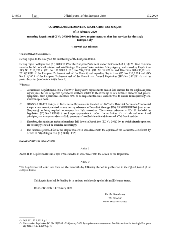 Regulation 2020/208 amending Regulation No 29/2009 on data link services for the SES