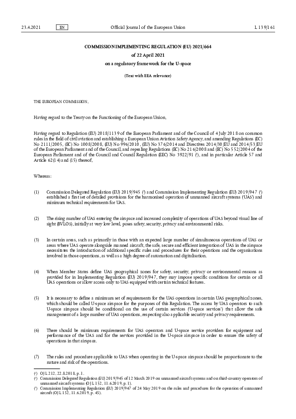 COMMISSION IMPLEMENTING REGULATION (EU) 2021/664 of 22 April 2021 on a regulatory framework for the U-space