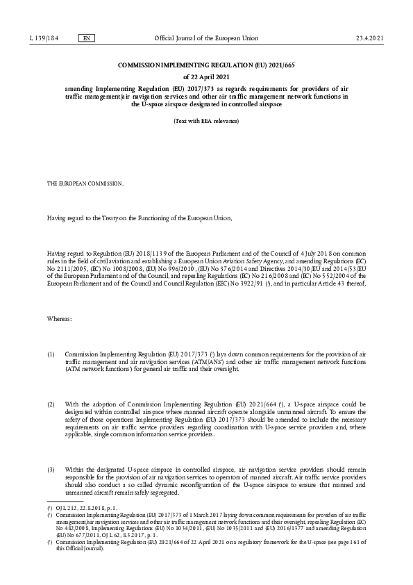 COMMISSION IMPLEMENTING REGULATION (EU) 2021/665 of 22 April 2021 amending Implementing Regulation (EU) 2017/373 as regards requirements for providers of air traffic management/air navigation services and other air traffic management network functions in the U-space airspace designated in controlled airspace.