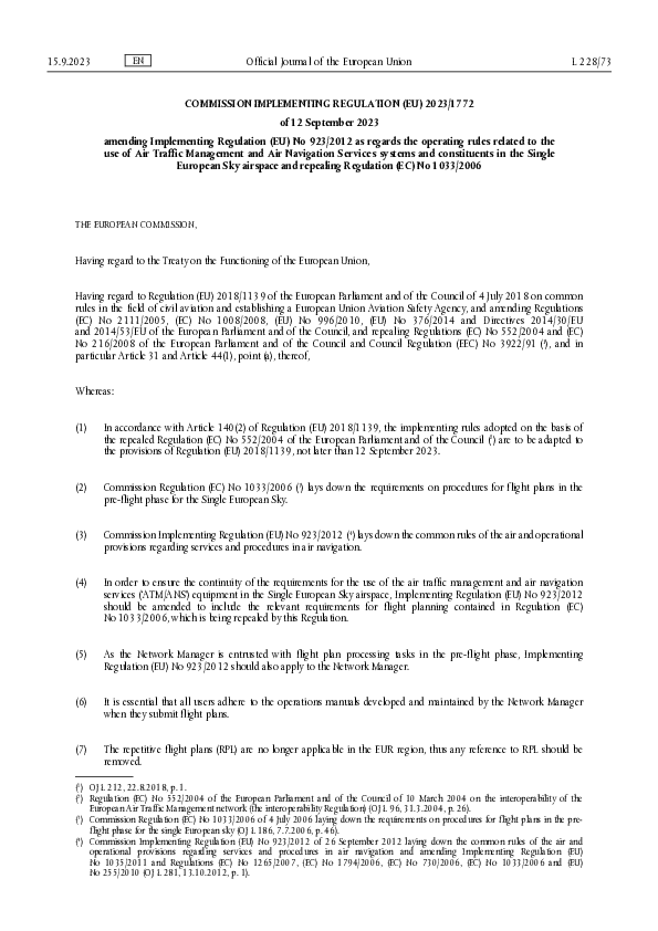 COMMISSION IMPLEMENTING REGULATION (EU) 2023/1772 of 12 September 2023 amending Implementing Regulation (EU) No 923/2012 as regards the operating rules related to the use of Air Traffic Management and Air Navigation Services systems and constituents in the Single European Sky airspace and repealing Regulation (EC) No 1033/2006.