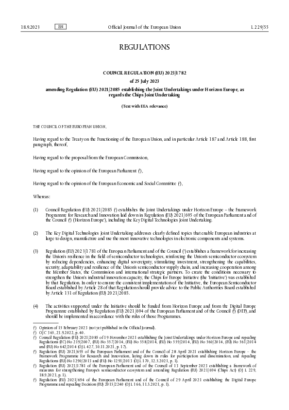 COUNCIL REGULATION (EU) 2023/1782 of 25 July 2023 amending Regulation (EU) 2021/2085 establishing the Joint Undertakings under Horizon Europe, as regards the Chips Joint Undertaking.
